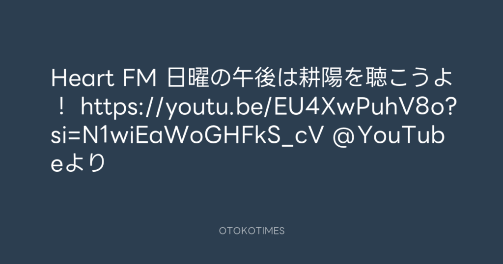 Heart FM 日曜の午後は耕陽を聴こうよ! https://youtu.be/EU4XwPuhV8o?si=N1wiEaW... -