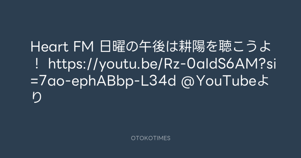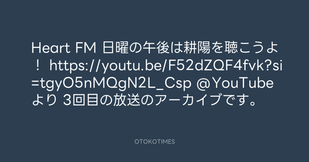 Heart FM 日曜の午後は耕陽を聴こうよ! https://youtu.be/F52dZQF4fvk?si=tgyO5nM... -