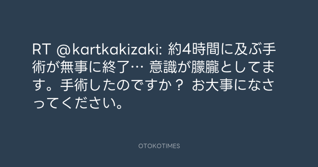 RT @kartkakizaki: 約4時間に及ぶ手術が無事に終了… 意識が朦朧としてます。手術し... -
