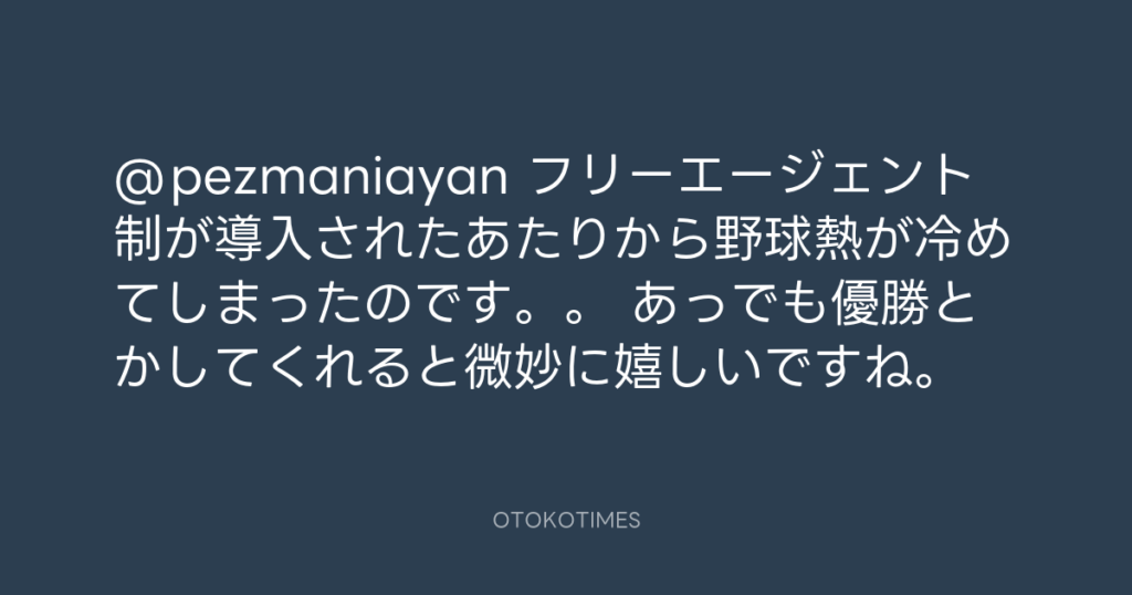 @pezmaniayan フリーエージェント制が導入されたあたりから野球熱が冷めてしまった... -