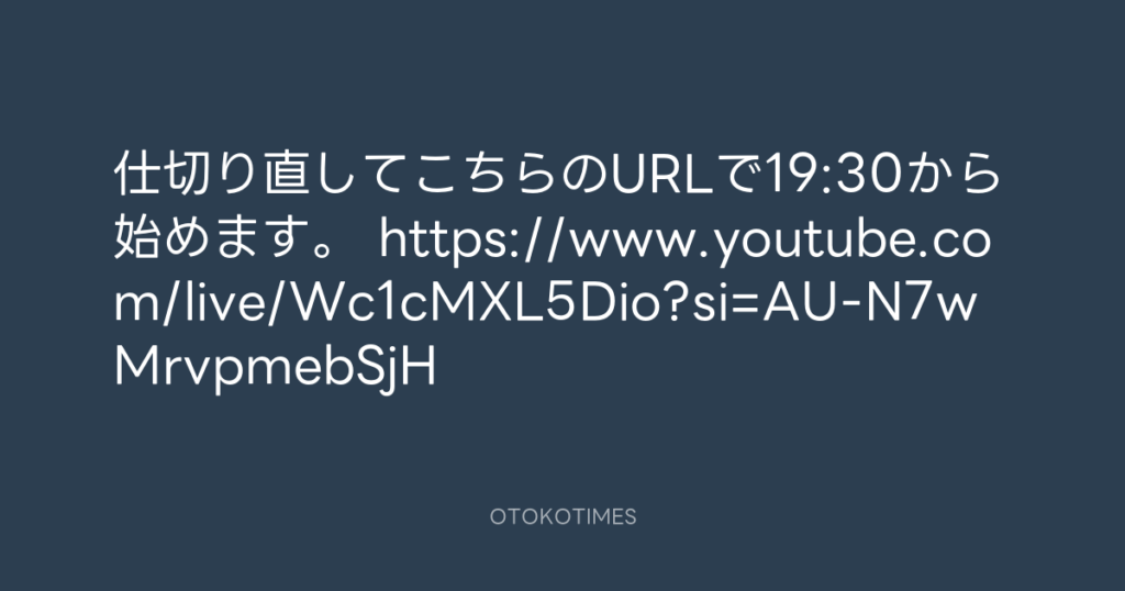 仕切り直してこちらのURLで19:30から始めます。 https://www.youtube.com/live/Wc1... -