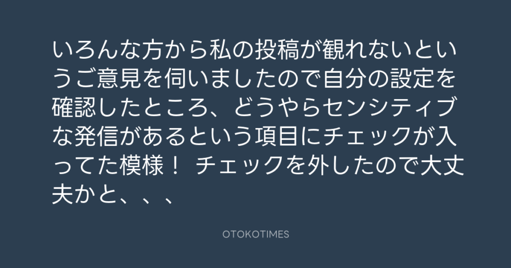いろんな方から私の投稿が観れないというご意見を伺いましたので自分の設定を確認... -