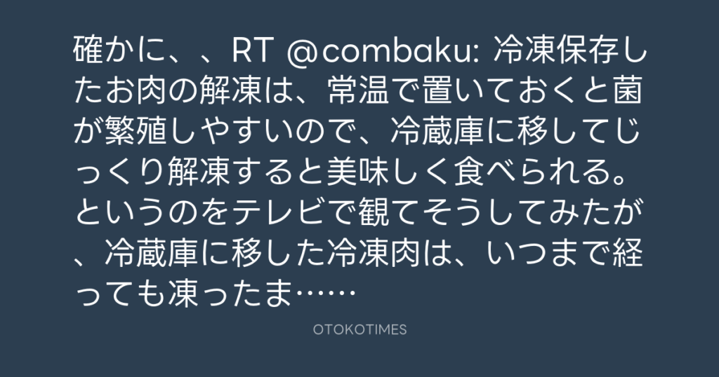 確かに、、RT @combaku: 冷凍保存したお肉の解凍は、常温で置いておくと菌が繁殖し... -