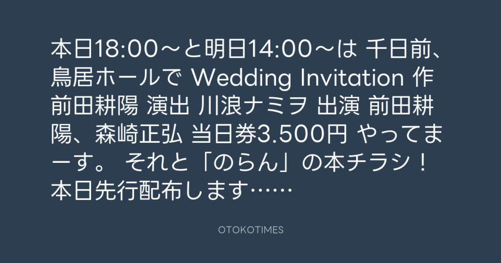 本日18:00〜と明日14:00〜は 千日前、鳥居ホールで Wedding Invitation 作 前田耕... -