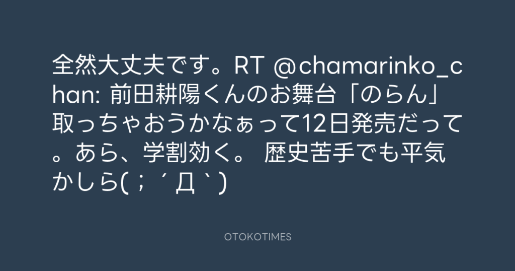 全然大丈夫です。RT @chamarinko_chan: 前田耕陽くんのお舞台「のらん」取っちゃお... -