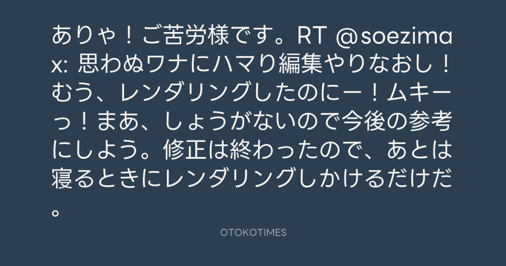 ありゃ!ご苦労様です。RT @soezimax: 思わぬワナにハマり編集やりなおし!むう、... -