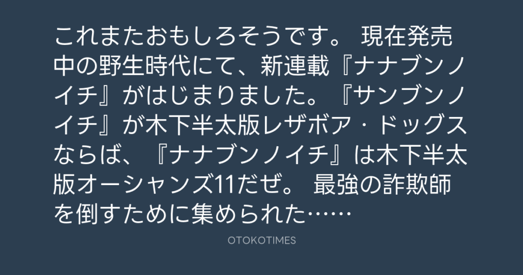これまたおもしろそうです。 現在発売中の野生時代にて、新連載『ナナブンノイチ』... -