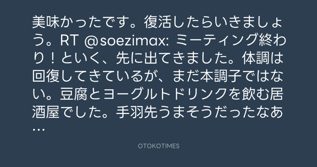 美味かったです。復活したらいきましょう。RT @soezimax: ミーティング終わり!と... -