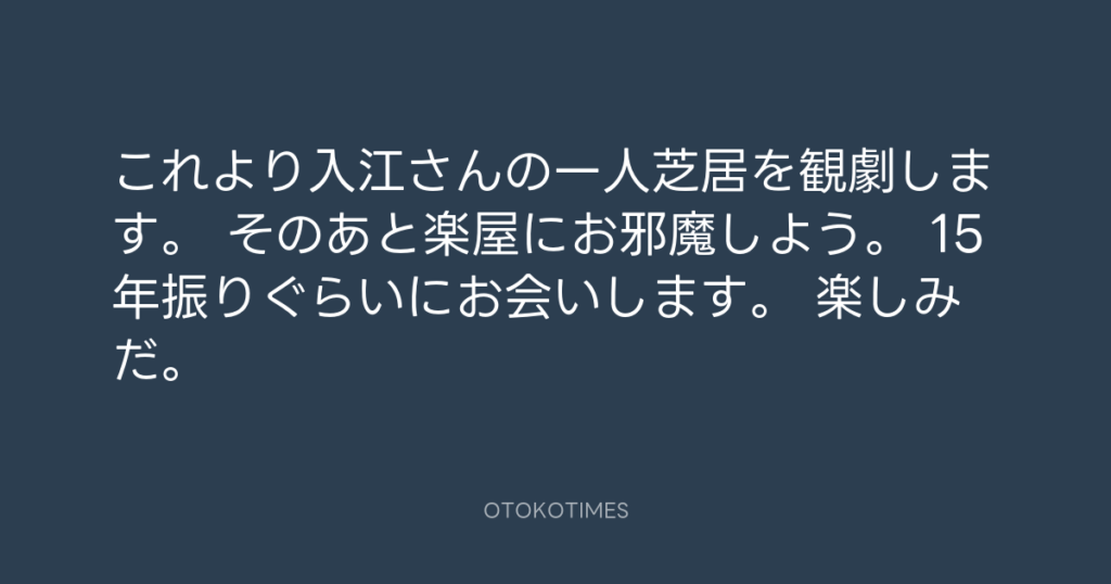 これより入江さんの一人芝居を観劇します。 そのあと楽屋にお邪魔しよう。 15年振... -