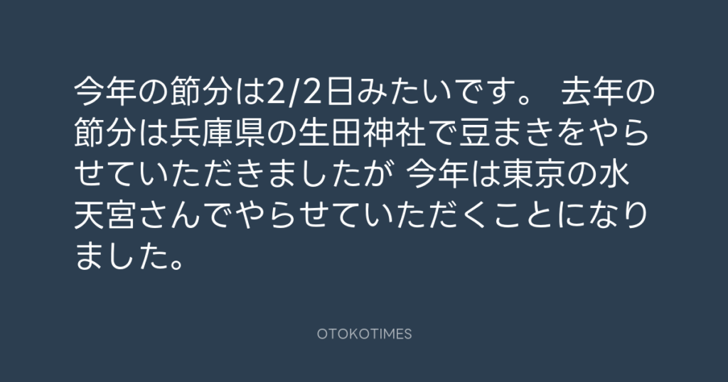 今年の節分は2/2日みたいです。 去年の節分は兵庫県の生田神社で豆まきをやらせて... -