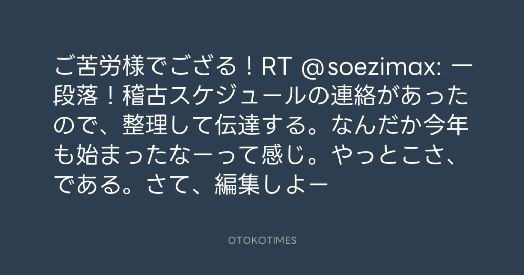 ご苦労様でござる!RT @soezimax: 一段落!稽古スケジュールの連絡があったので、... -