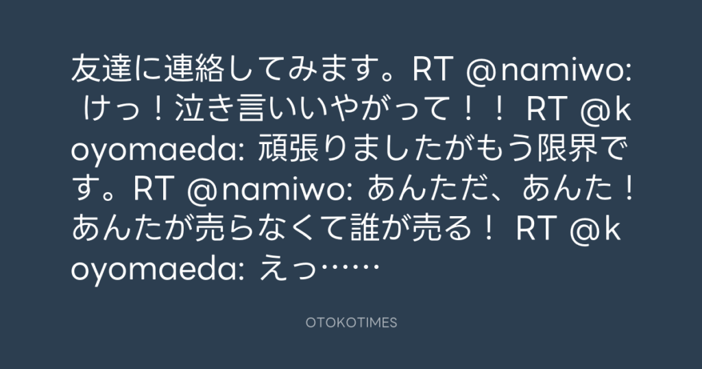 友達に連絡してみます。RT @namiwo: けっ!泣き言いいやがって!! RT @koyomaeda:... -