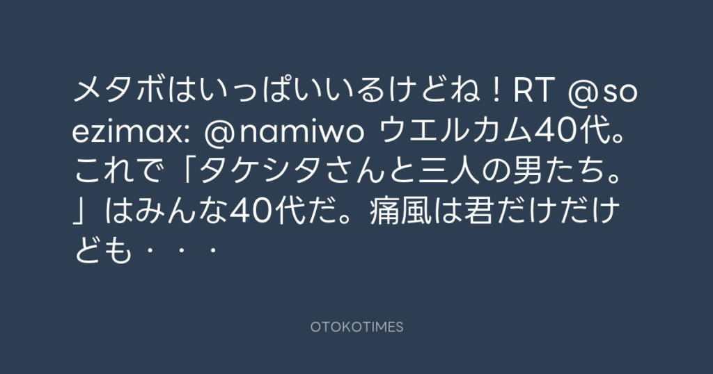 メタボはいっぱいいるけどね!RT @soezimax: @namiwo ウエルカム40代。これで「タ... -