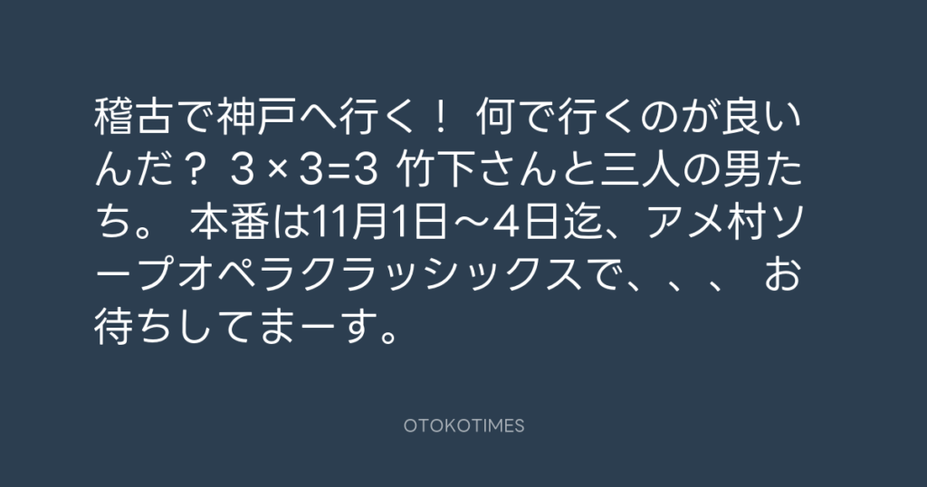稽古で神戸へ行く! 何で行くのが良いんだ? 3×3=3 竹下さんと三人の男たち。 本番... -