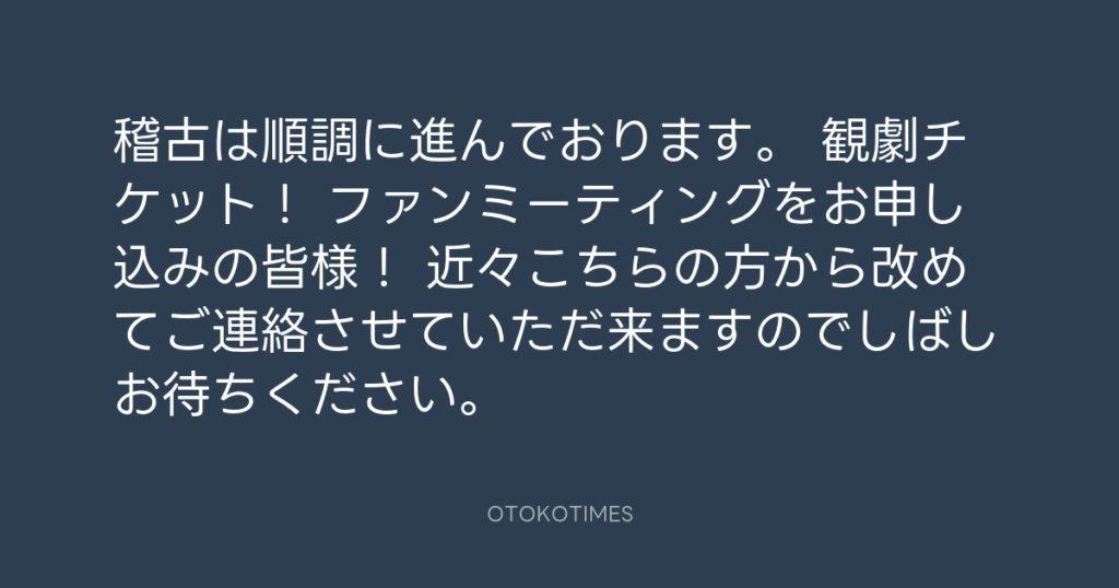 稽古は順調に進んでおります。 観劇チケット! ファンミーティングをお申し込みの... -