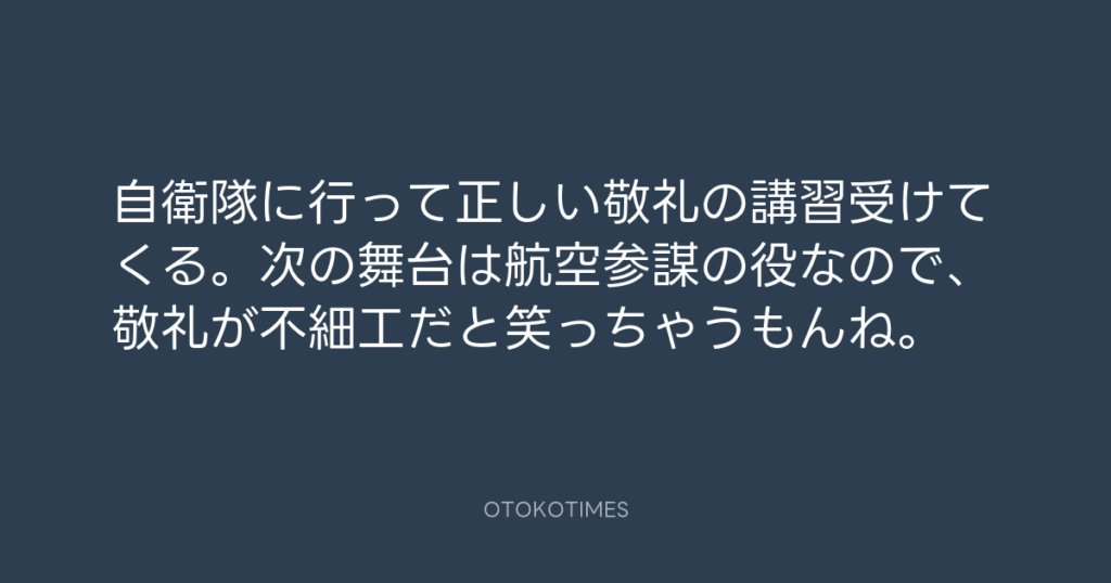 自衛隊に行って正しい敬礼の講習受けてくる。次の舞台は航空参謀の役なので、敬礼...