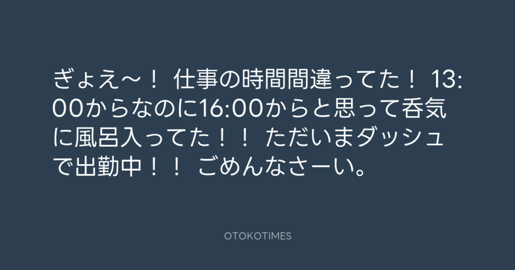 ぎょえ〜! 仕事の時間間違ってた! 13:00からなのに16:00からと思って呑気に風呂... -