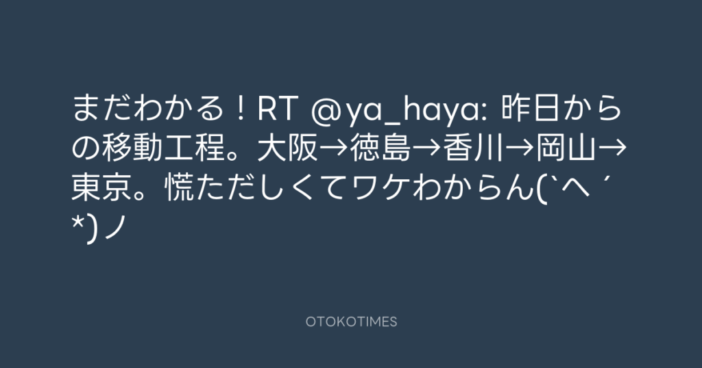まだわかる!RT @ya_haya: 昨日からの移動工程。大阪→徳島→香川→岡山→東京。慌ただ... -
