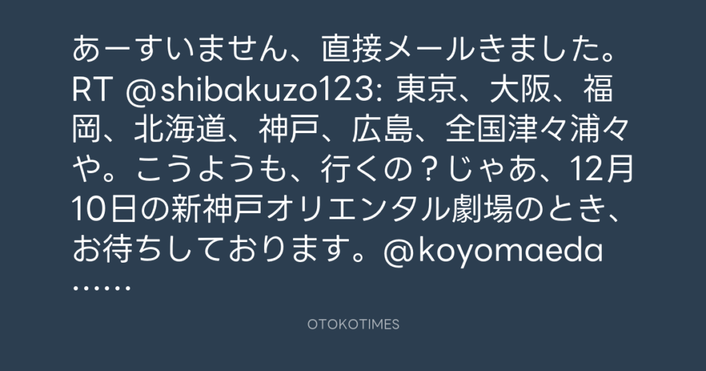 あーすいません、直接メールきました。RT @shibakuzo123: 東京、大阪、福岡、北海... -