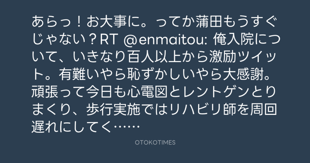 あらっ!お大事に。ってか蒲田もうすぐじゃない?RT @enmaitou: 俺入院について、... -