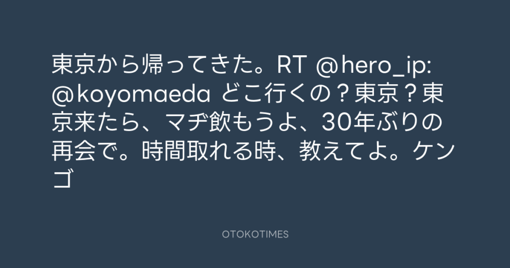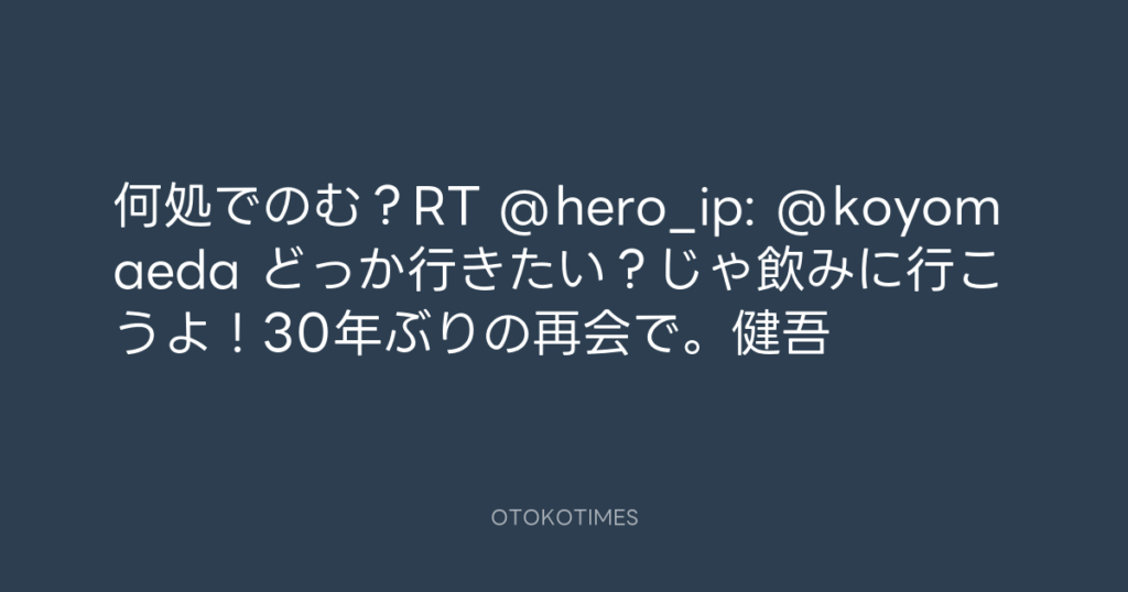 何処でのむ?RT @hero_ip: @koyomaeda どっか行きたい?じゃ飲みに行こうよ!30年... -