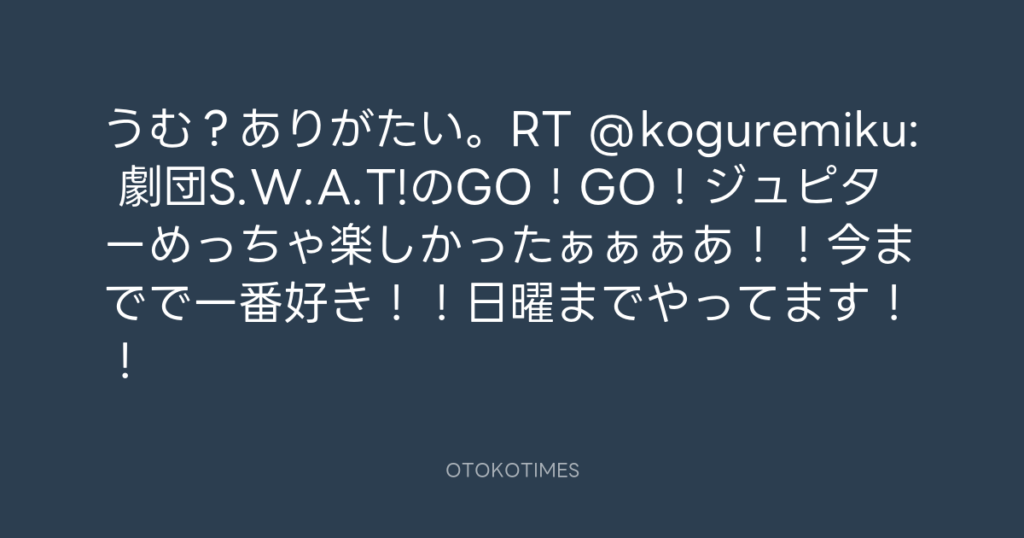 うむ?ありがたい。RT @koguremiku: 劇団S.W.A.T!のGO!GO!ジュピターめっちゃ楽... -