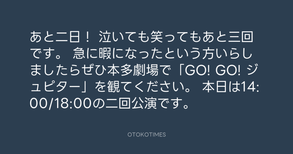 あと二日! 泣いても笑ってもあと三回です。 急に暇になったという方いらしました... -