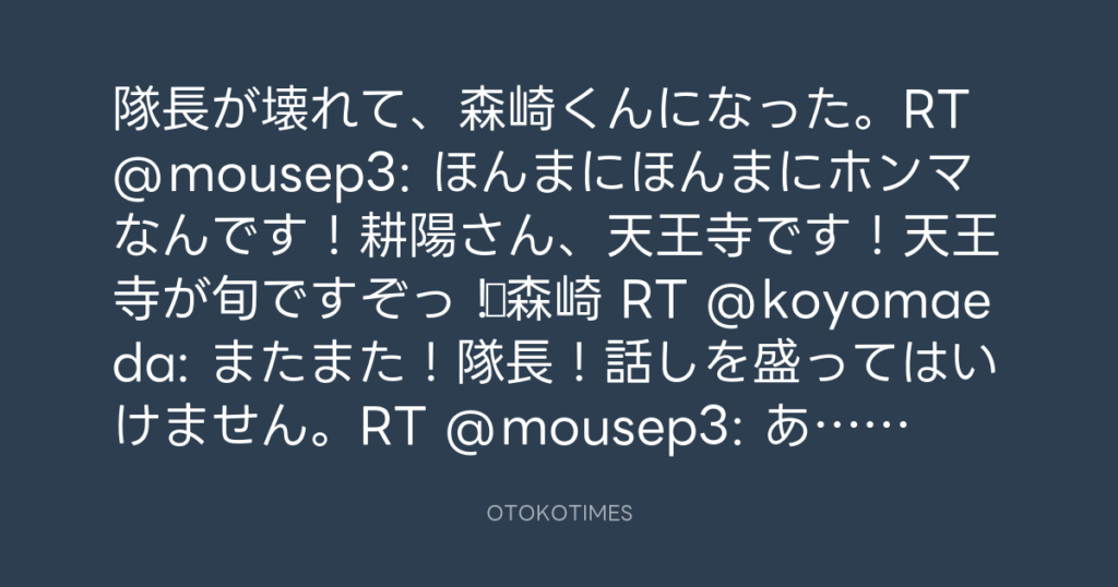 隊長が壊れて、森崎くんになった。RT @mousep3: ほんまにほんまにホンマなんです!... -