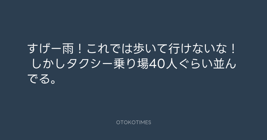 すげー雨!これでは歩いて行けないな! しかしタクシー乗り場40人ぐらい並んでる。 -