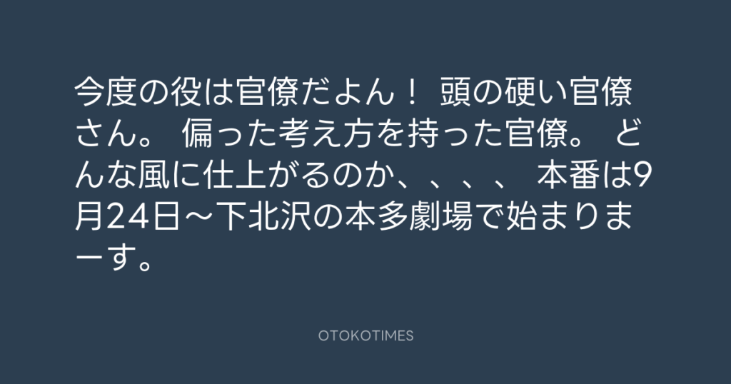 今度の役は官僚だよん! 頭の硬い官僚さん。 偏った考え方を持った官僚。 どんな風...