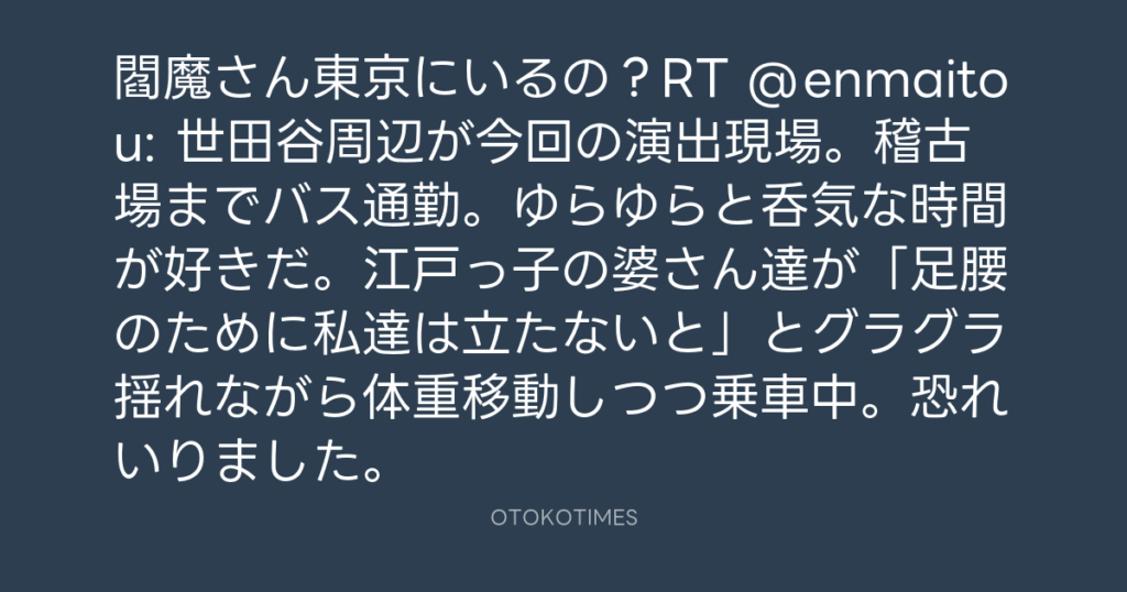 閻魔さん東京にいるの?RT @enmaitou: 世田谷周辺が今回の演出現場。稽古場までバ... -