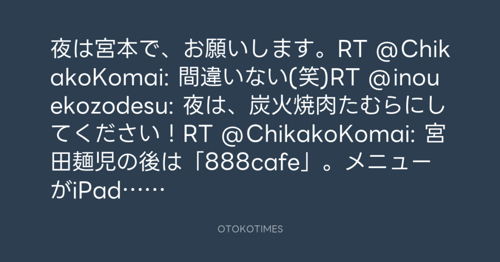 夜は宮本で、お願いします。RT @ChikakoKomai: 間違いない(笑)RT @inouekozodesu: ... -