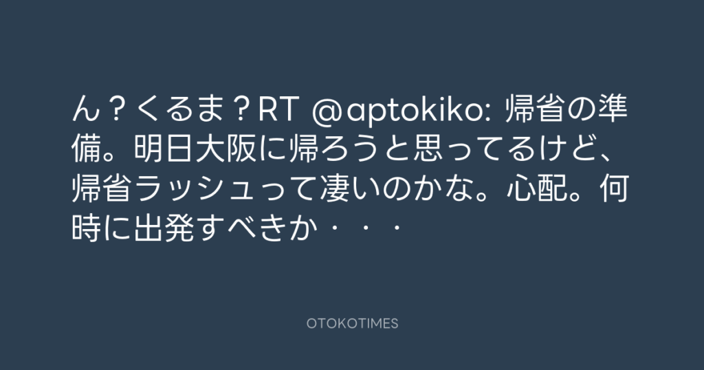ん?くるま?RT @aptokiko: 帰省の準備。明日大阪に帰ろうと思ってるけど、帰省ラ... -