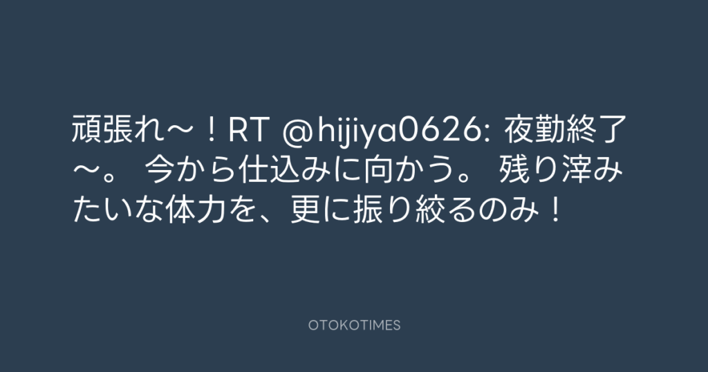 頑張れ~!RT @hijiya0626: 夜勤終了〜。 今から仕込みに向かう。 残り滓みたいな... -