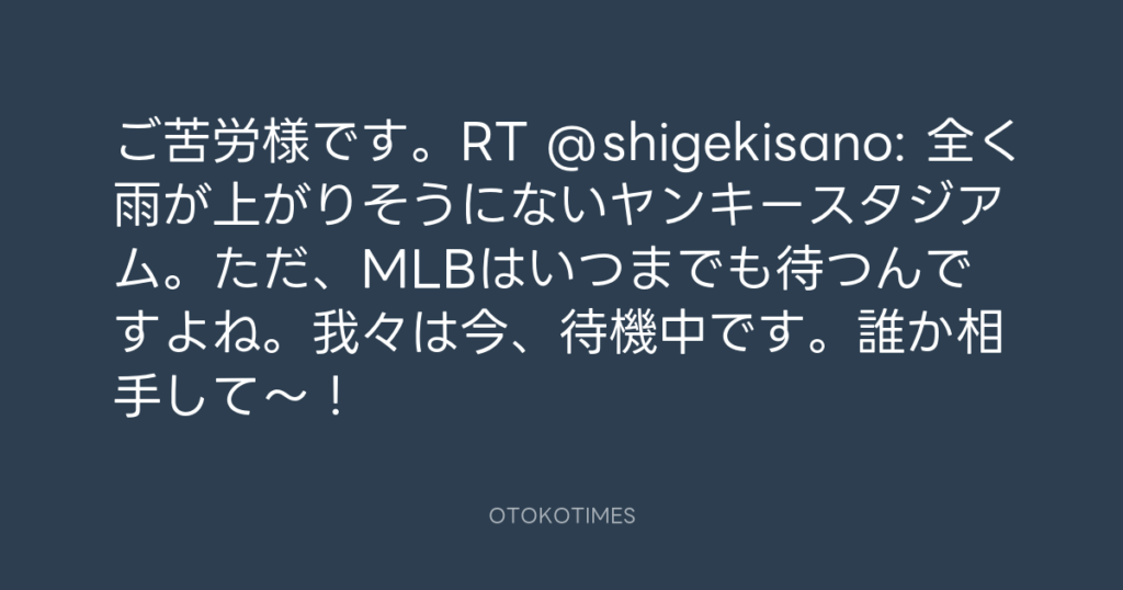 ご苦労様です。RT @shigekisano: 全く雨が上がりそうにないヤンキースタジアム。た...