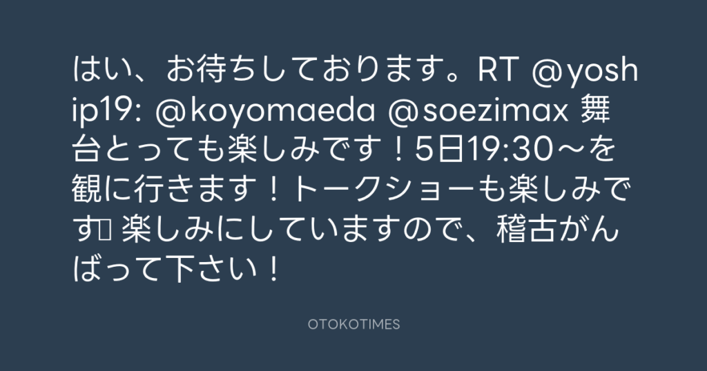 はい、お待ちしております。RT @yoship19: @koyomaeda @soezimax 舞台とっても楽し... -
