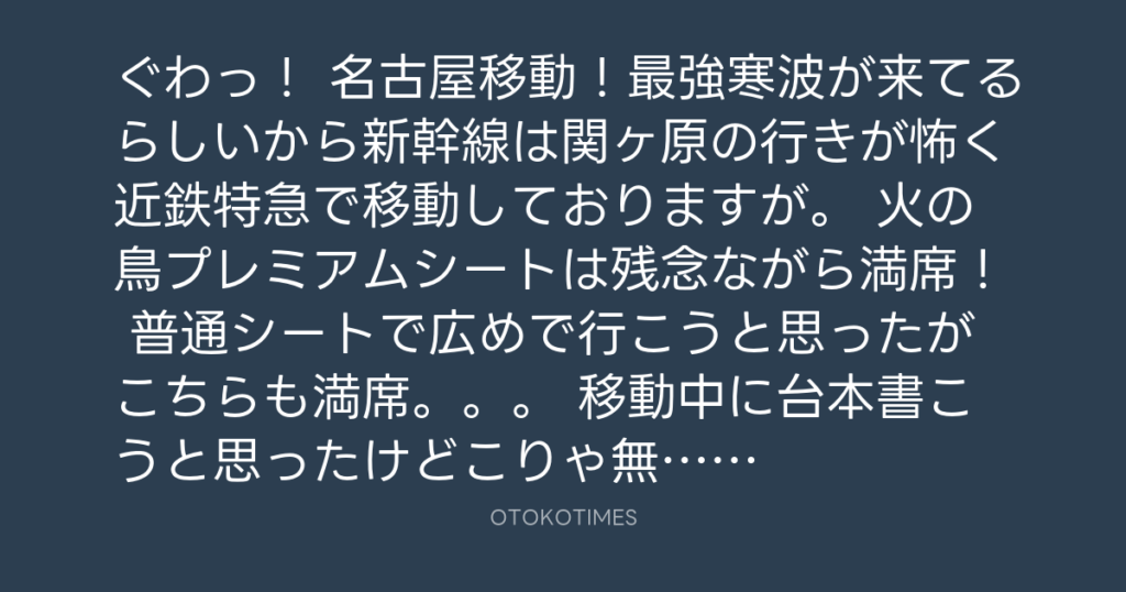 ぐわっ! 名古屋移動!最強寒波が来てるらしいから新幹線は関ヶ原の行きが怖く近鉄... -