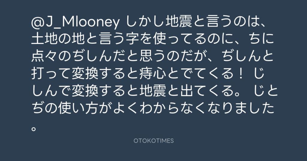 @J_Mlooney しかし地震と言うのは、土地の地と言う字を使ってるのに、ちに点々のぢ... -