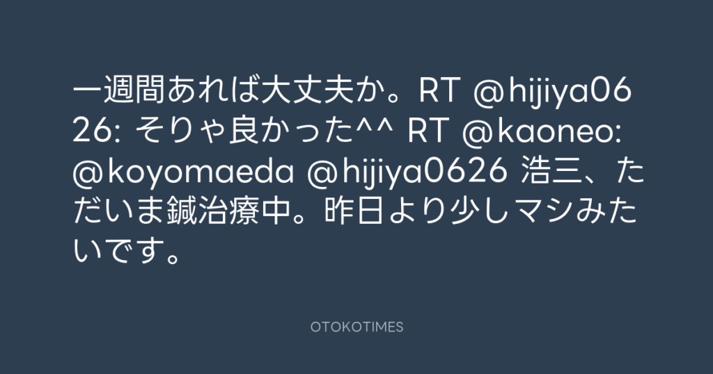 一週間あれば大丈夫か。RT @hijiya0626: そりゃ良かった^^ RT @kaoneo: @koyomaeda...