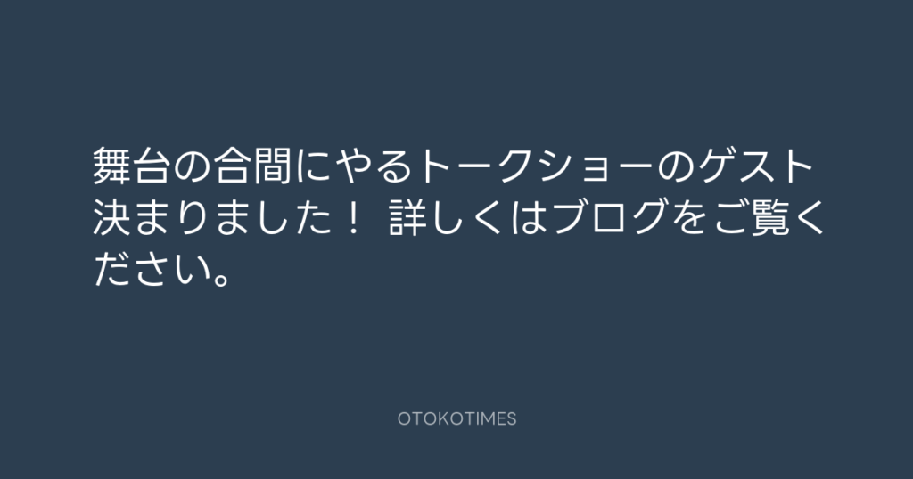 舞台の合間にやるトークショーのゲスト決まりました! 詳しくはブログをご覧くださ... -