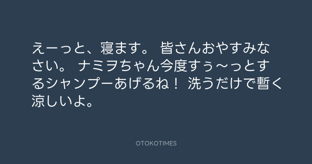 えーっと、寝ます。 皆さんおやすみなさい。 ナミヲちゃん今度すぅ~っとするシャ... -