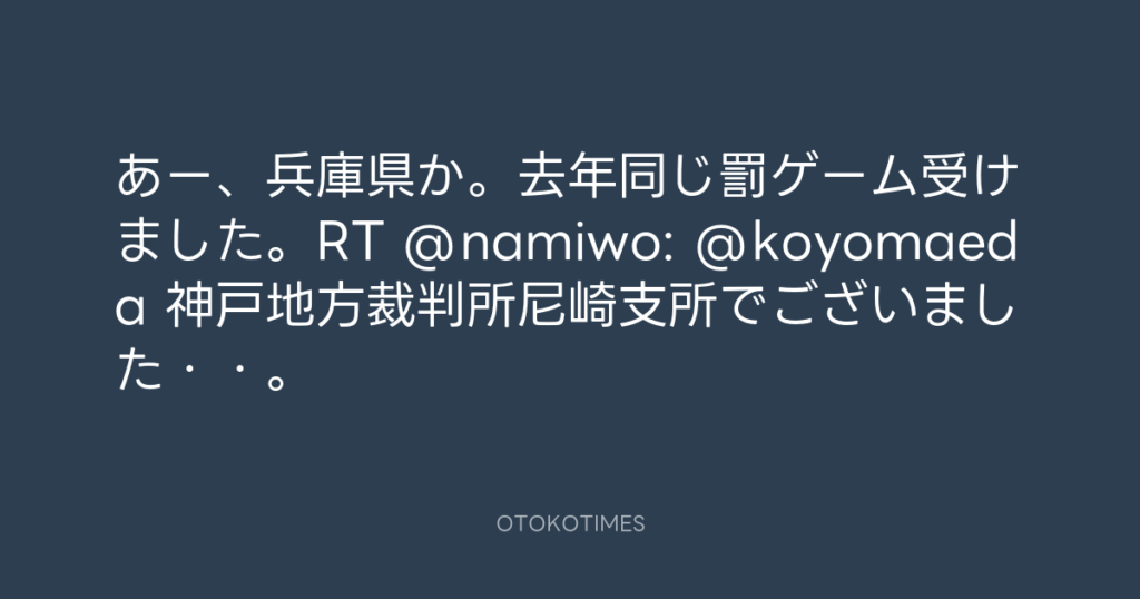 あー、兵庫県か。去年同じ罰ゲーム受けました。RT @namiwo: @koyomaeda 神戸地方裁... -