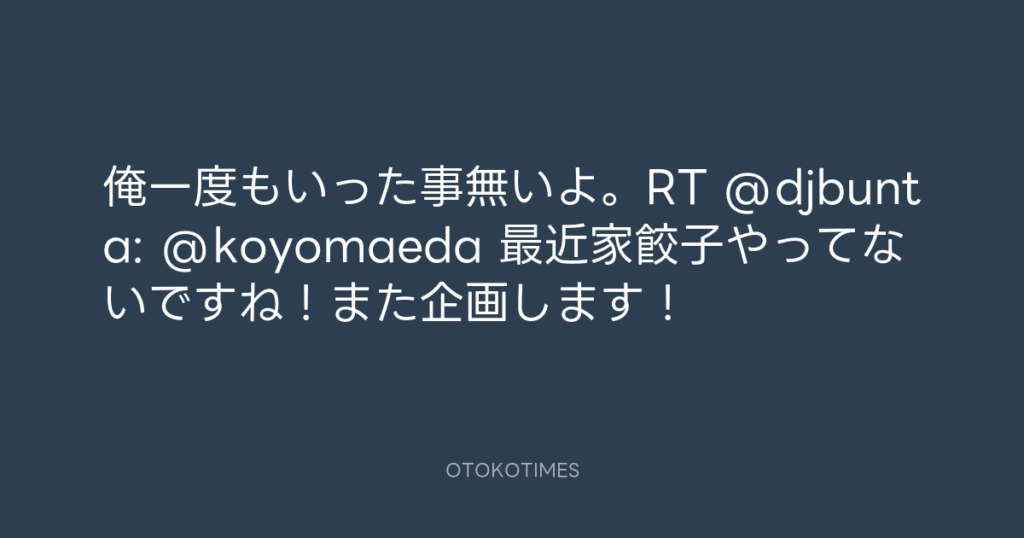 俺一度もいった事無いよ。RT @djbunta: @koyomaeda 最近家餃子やってないですね!... -
