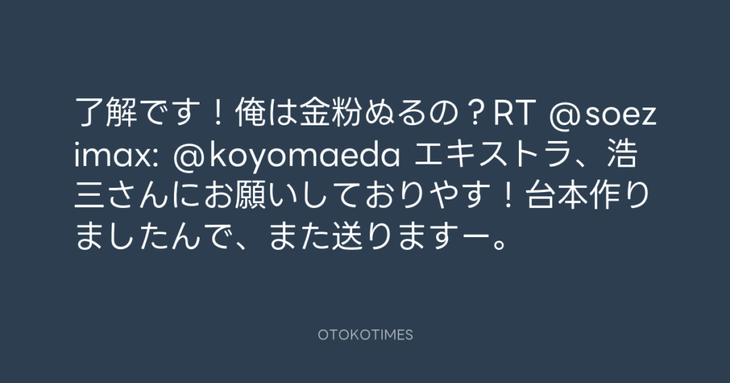 了解です!俺は金粉ぬるの?RT @soezimax: @koyomaeda エキストラ、浩三さんにお願...