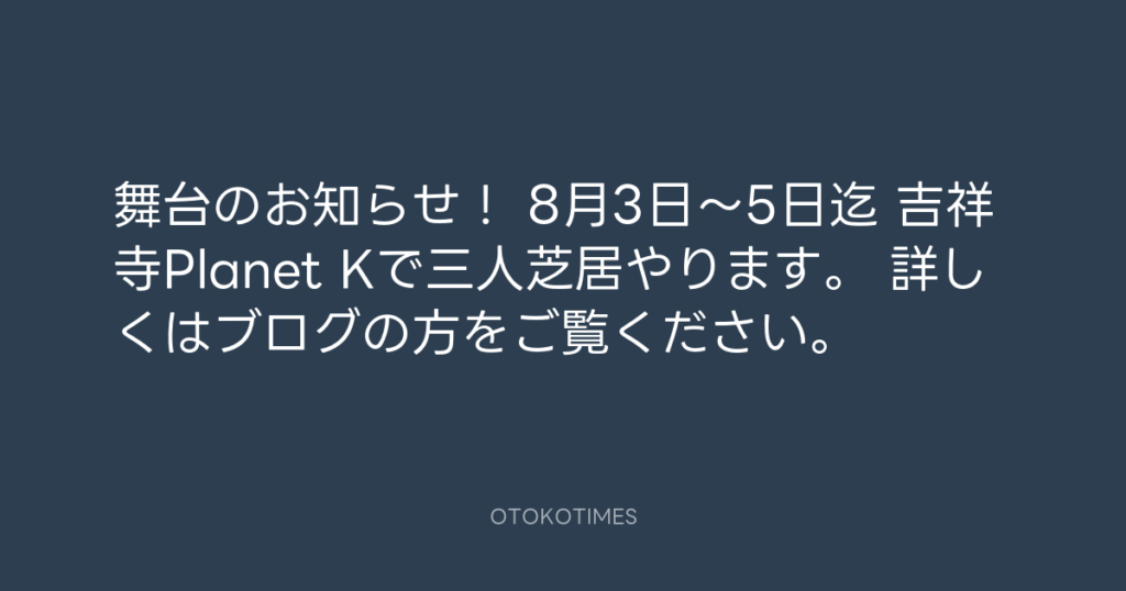 舞台のお知らせ! 8月3日〜5日迄 吉祥寺Planet Kで三人芝居やります。 詳しくはブ... -