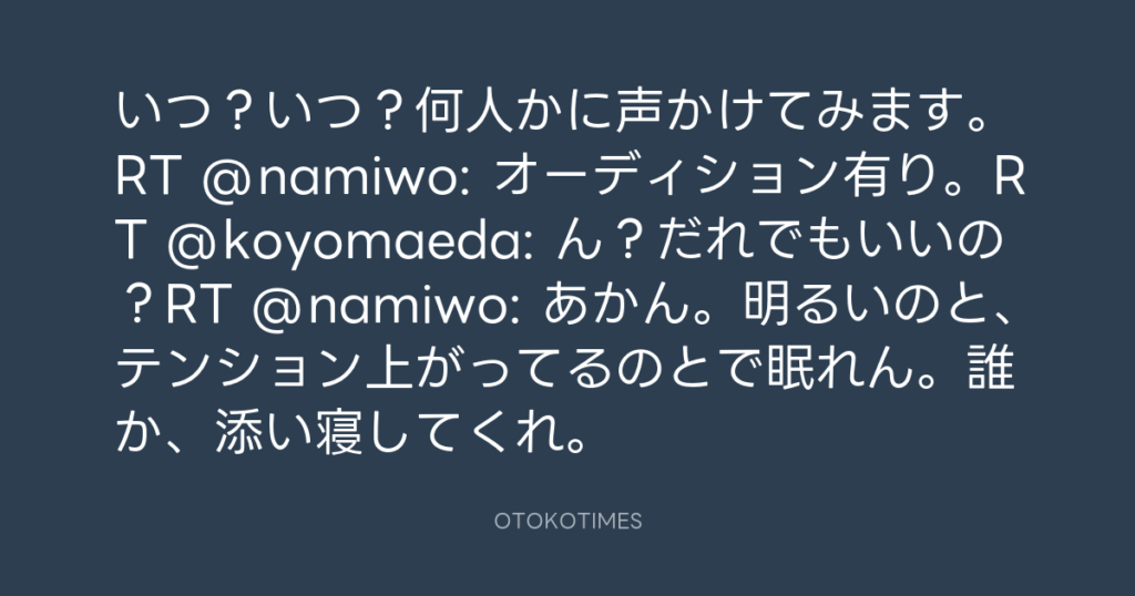 いつ?いつ?何人かに声かけてみます。RT @namiwo: オーディション有り。RT @koyom... -
