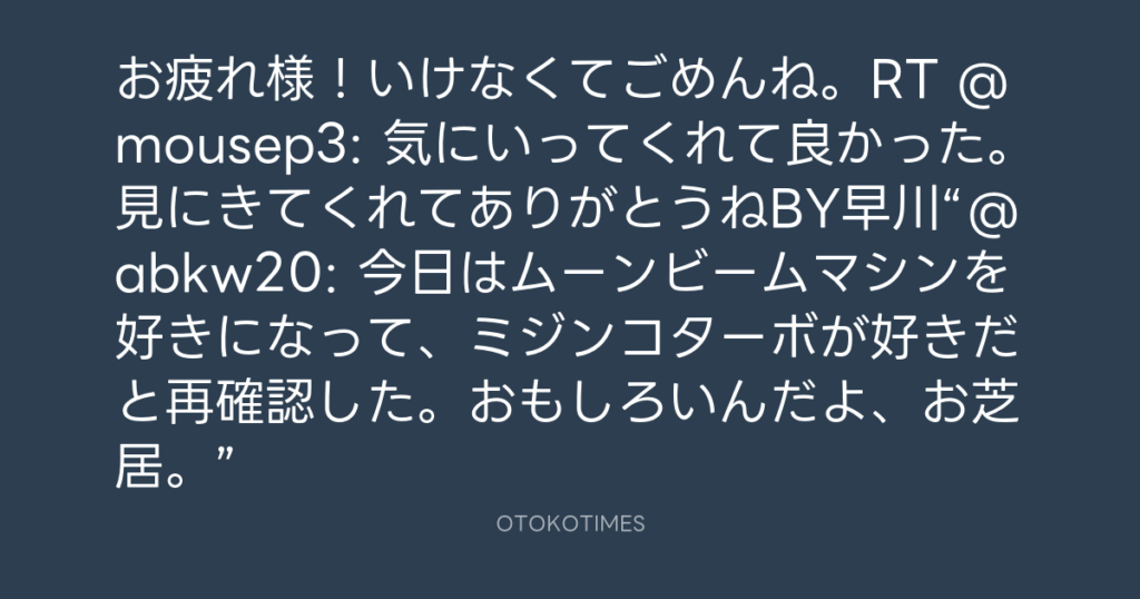 お疲れ様!いけなくてごめんね。RT @mousep3: 気にいってくれて良かった。見にきて... -