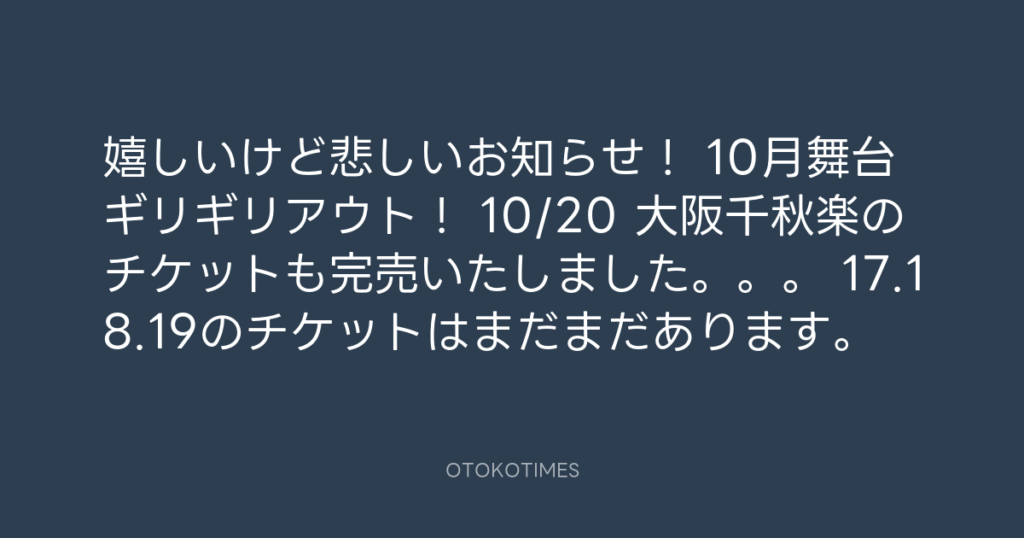 嬉しいけど悲しいお知らせ! 10月舞台 ギリギリアウト! 10/20 大阪千秋楽のチケッ... -