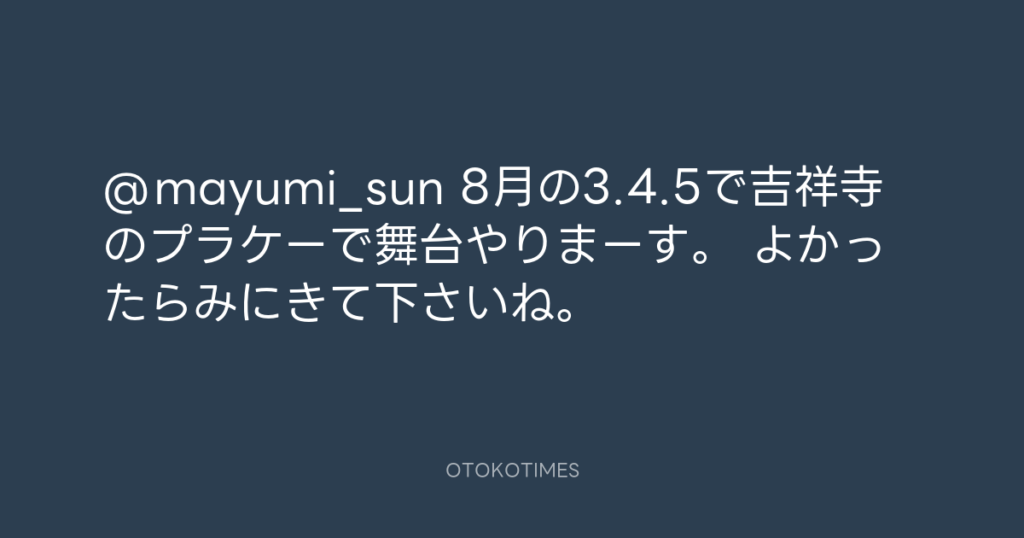 @mayumi_sun 8月の3.4.5で吉祥寺のプラケーで舞台やりまーす。 よかったらみにきて... -