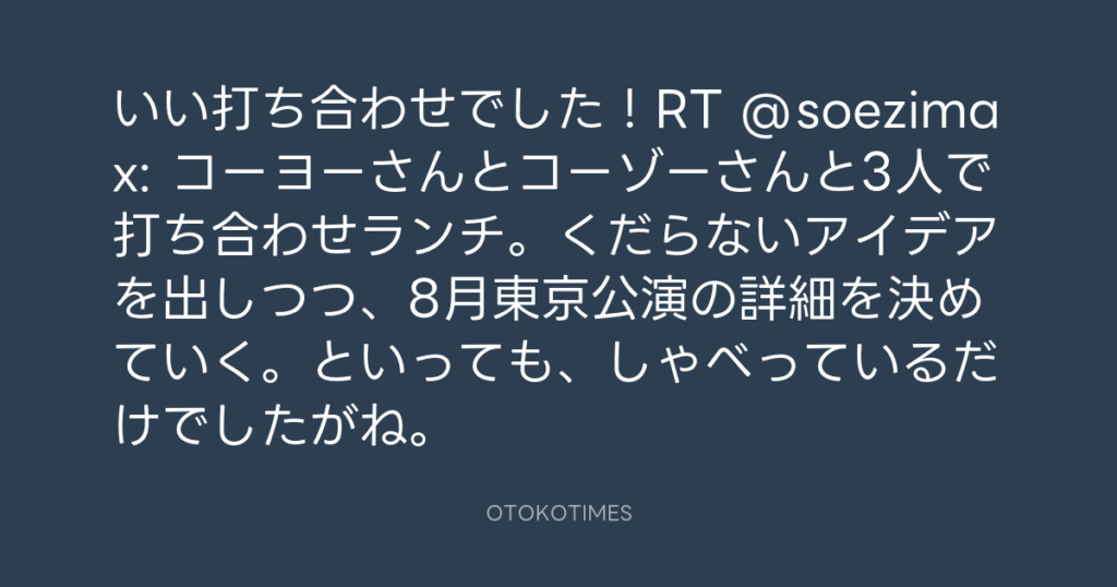 いい打ち合わせでした!RT @soezimax: コーヨーさんとコーゾーさんと3人で打ち合わ... -